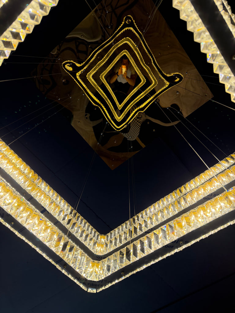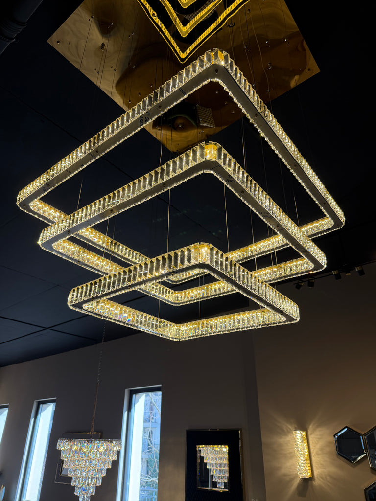 Készleten • 1 db • Bemutatótermi modellEgyedi gyártású, háromszintes geometrikus függeszték a Zebrano Project kollekciójából. A három kocka 60 cm, 80 cm és 100 cm méretű, T1 arany felülettel. A fólia a fémrészeken még szándékosan fennhagyva – a bemutatótermi használat során így óvtuk a felületet. A belógás teljes mértékben állítható.