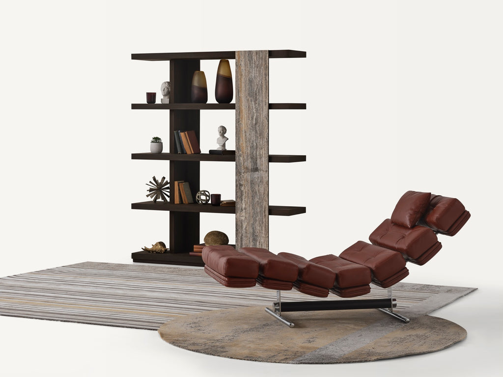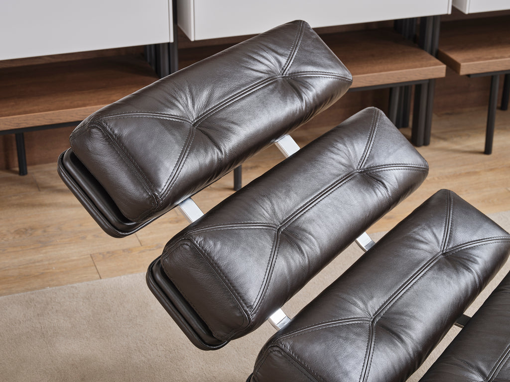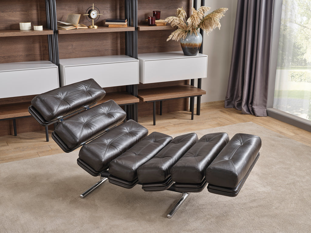 The unique, segmented seating surface is available in premium leather or textile upholstery. The stainless steel leg structure guarantees stability, while the spectacular design guarantees timeless elegance.