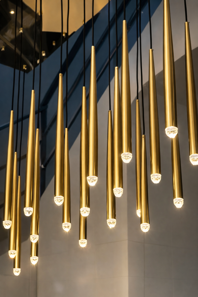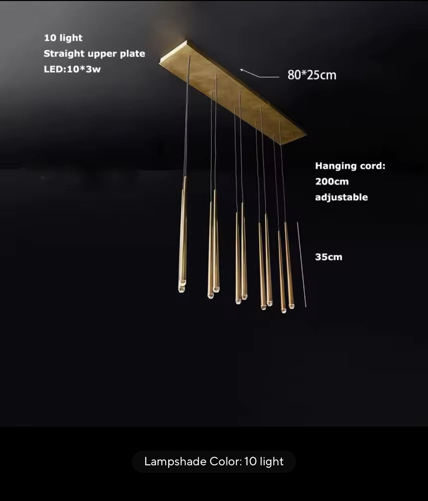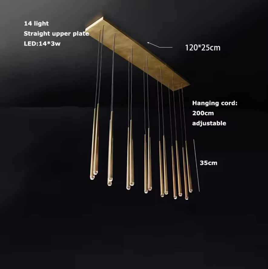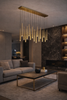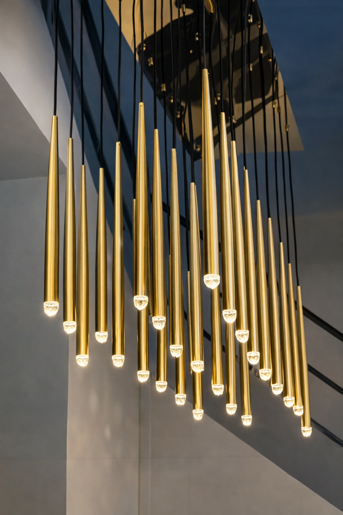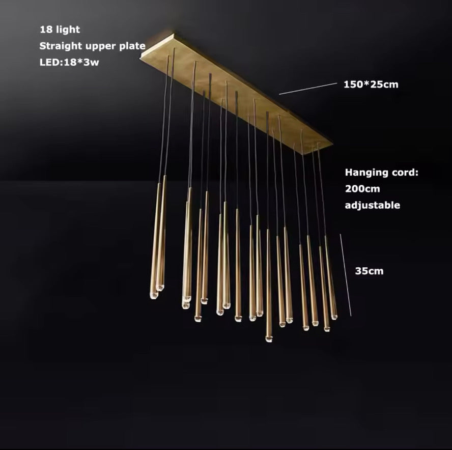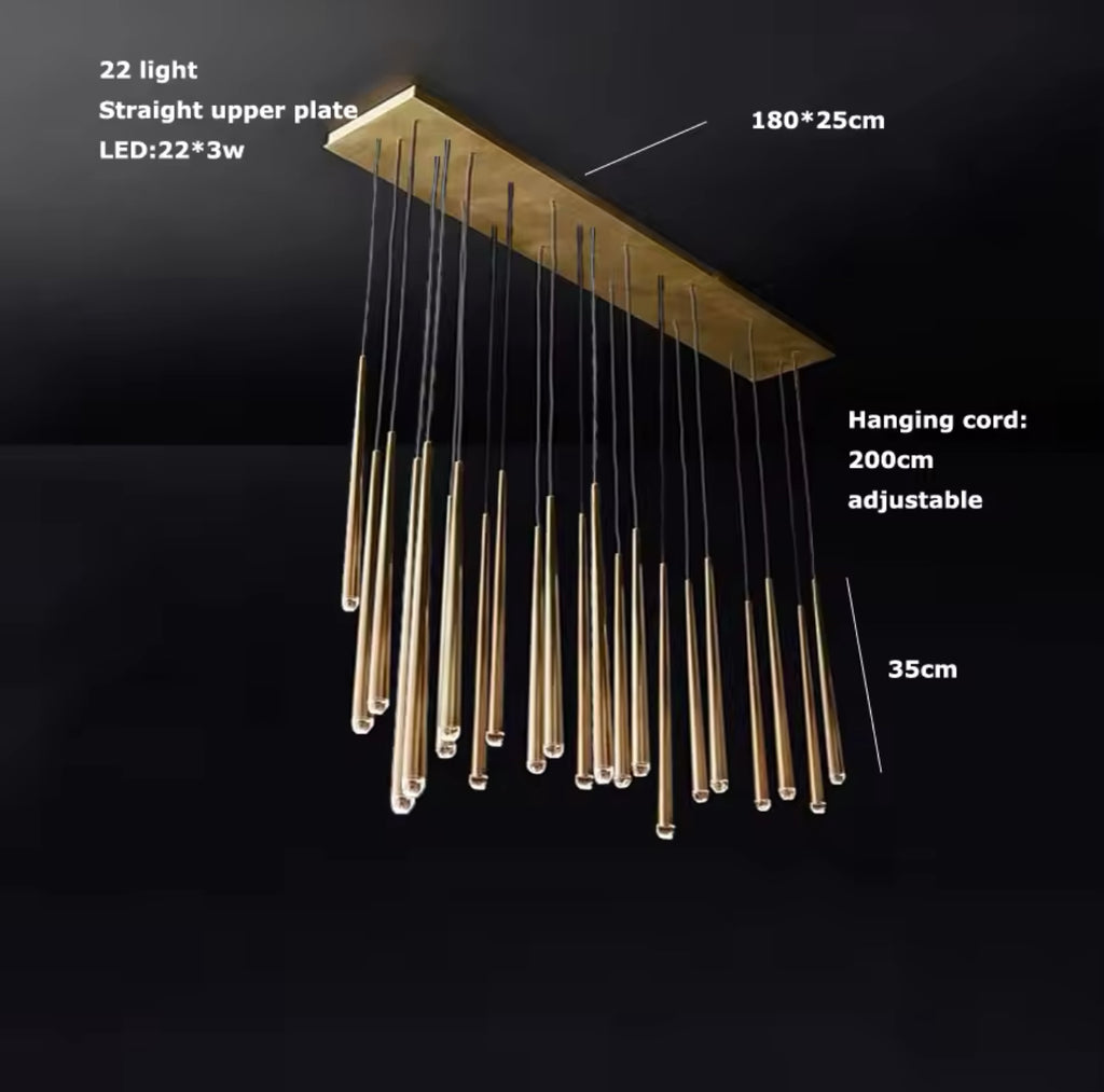 The Aurora Brass Drops – Linear Edition is a modern and elegant LED ceiling light, which with its unique gold suspensions and longitudinal, raindrop-like design creates a stunning look in any space. Perfect for highlighting dining tables, kitchen islands or elongated space shapes. The clean shape of the gold bodies and the warm white light together radiate timeless luxury.