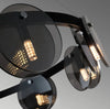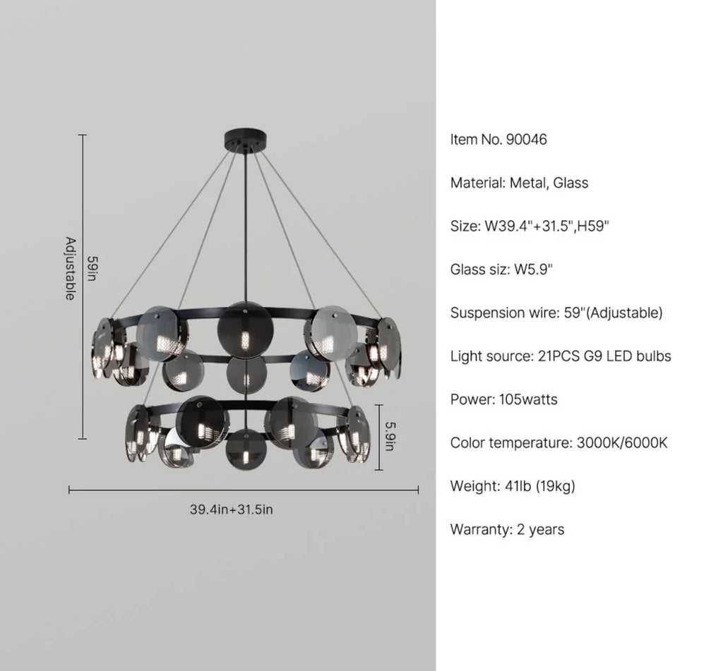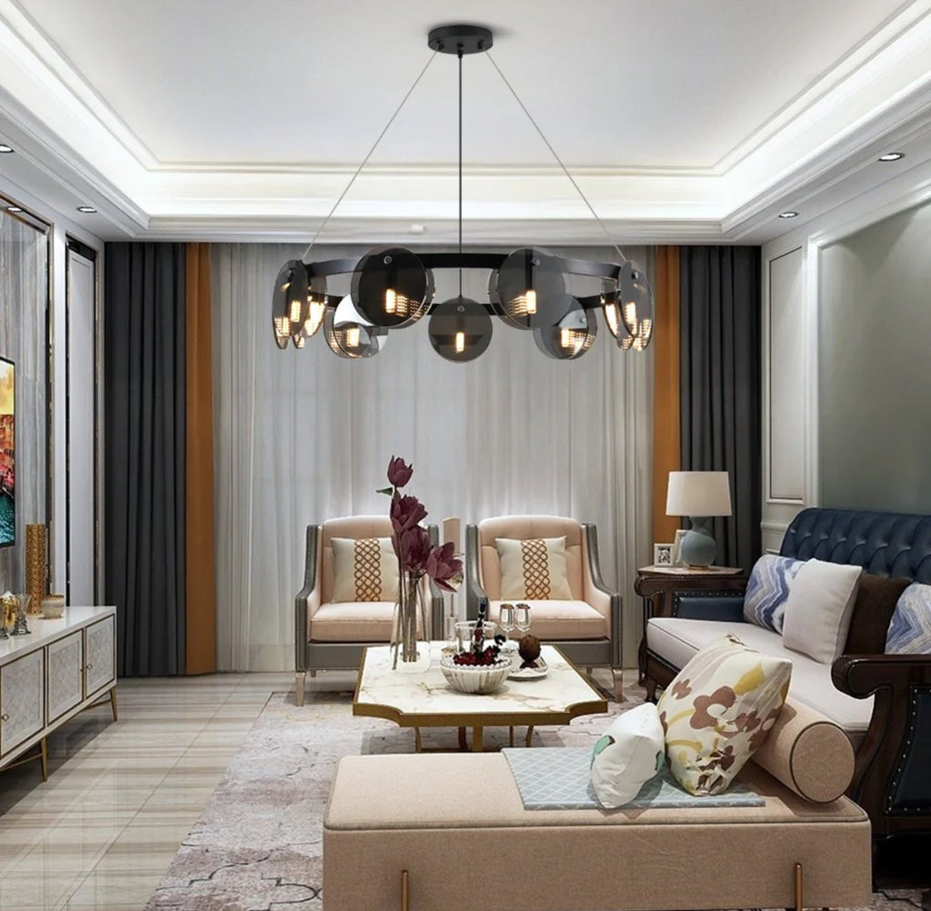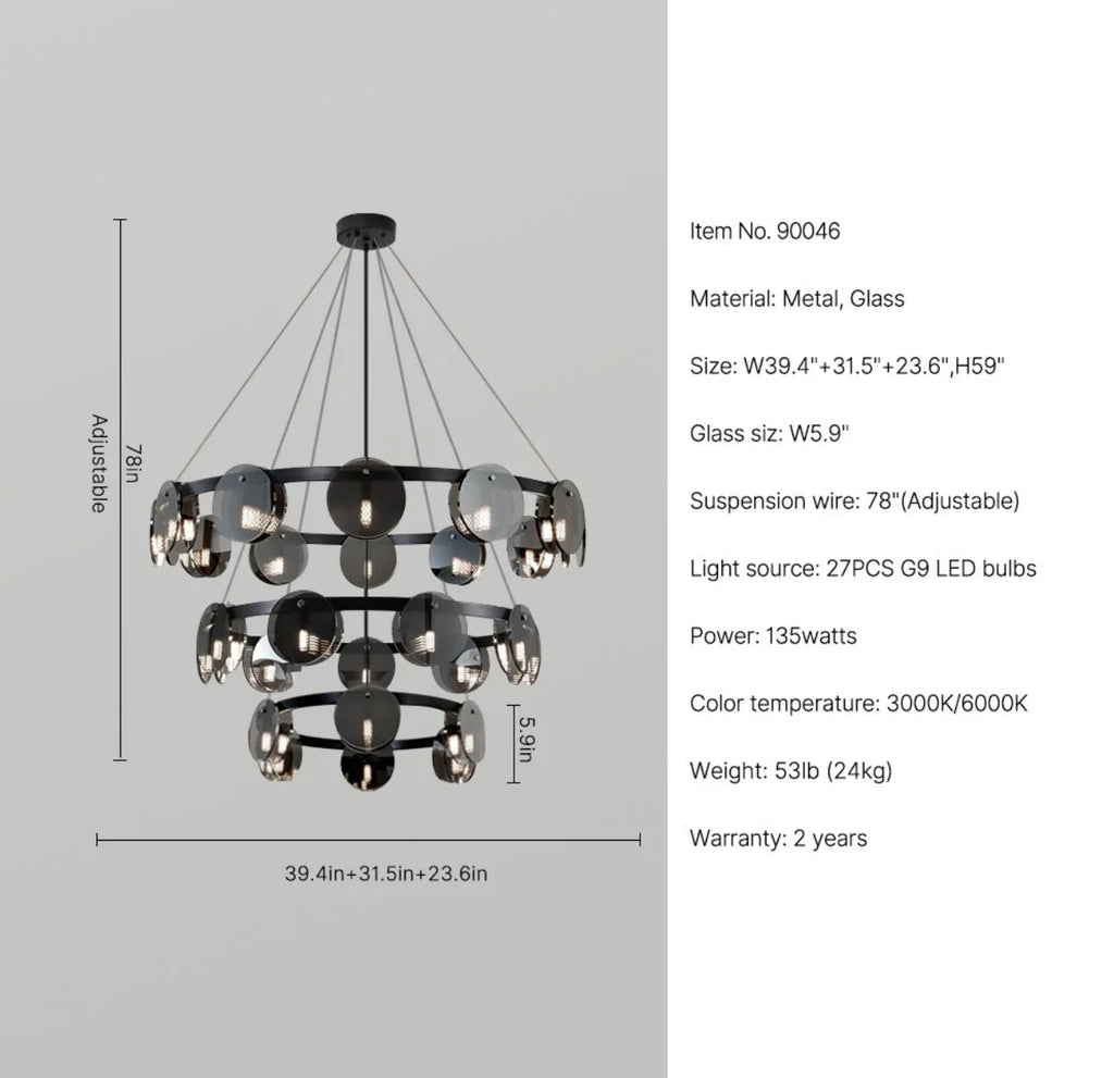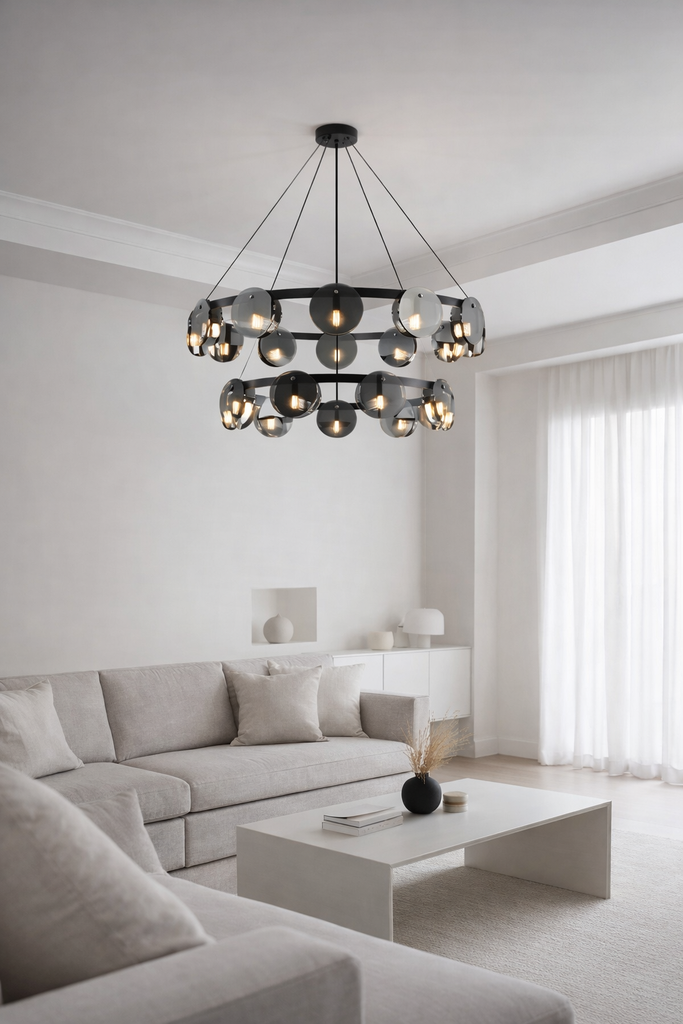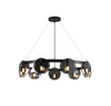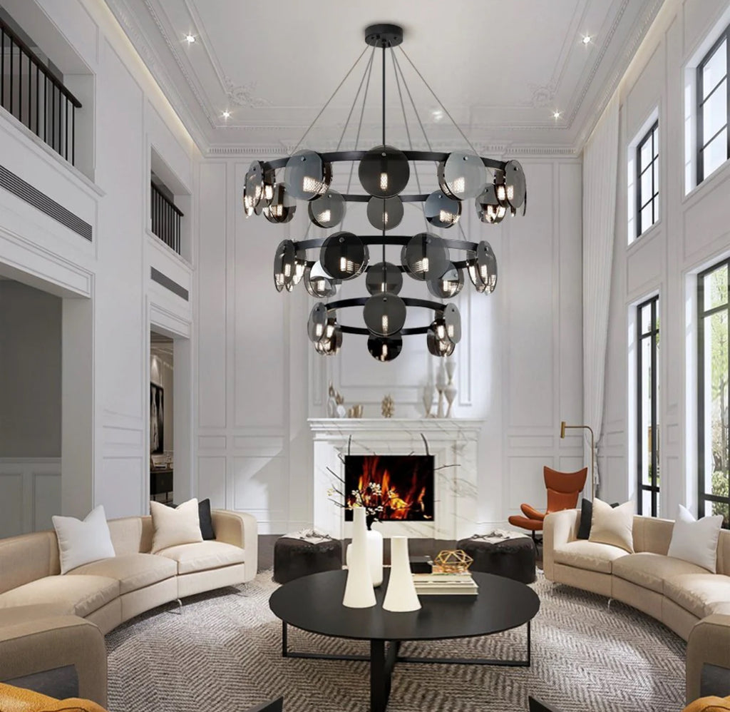 Premium-looking multi-ring chandelier with smoked glass discs and black with metal frame. Ideal for high-ceilinged living rooms, dining rooms and representative spaces where lighting becomes a real visual element.