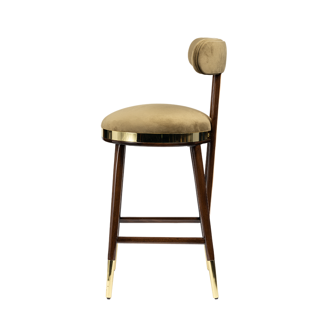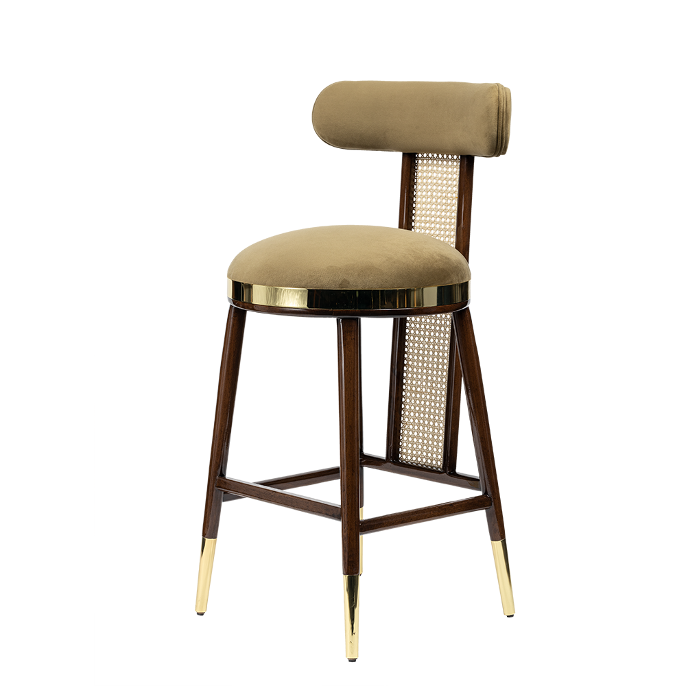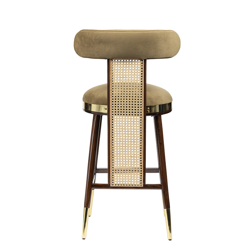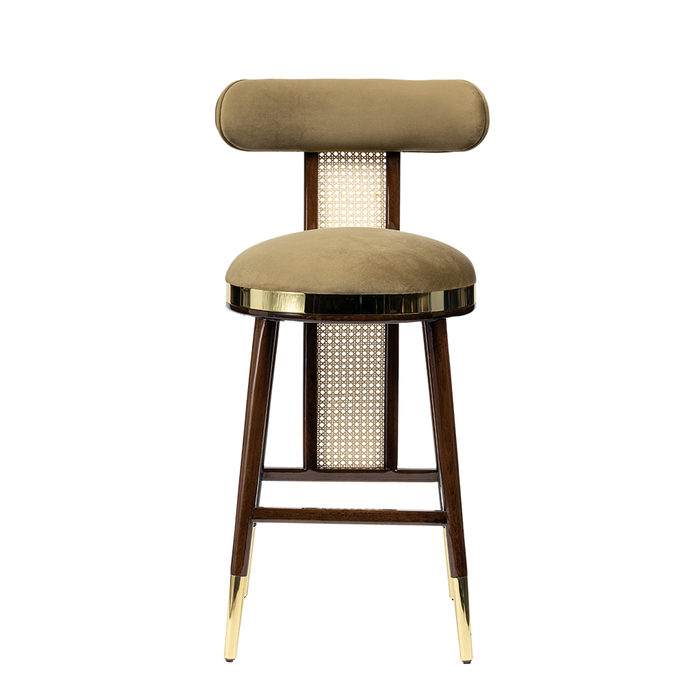 A Zen bárszék a letisztult elegancia és a kifinomult részletesség megtestesítője. A kerekített háttámla természetes nádberakással készült, amely egyedi karaktert ad a bútornak, míg a bársonyos ülőfelület és a polírozott aranyfém elemek a luxus érzetét erősítik. Ideális választás prémium enteriőrökbe, legyen szó modern étkezőről vagy exkluzív bárpultról.